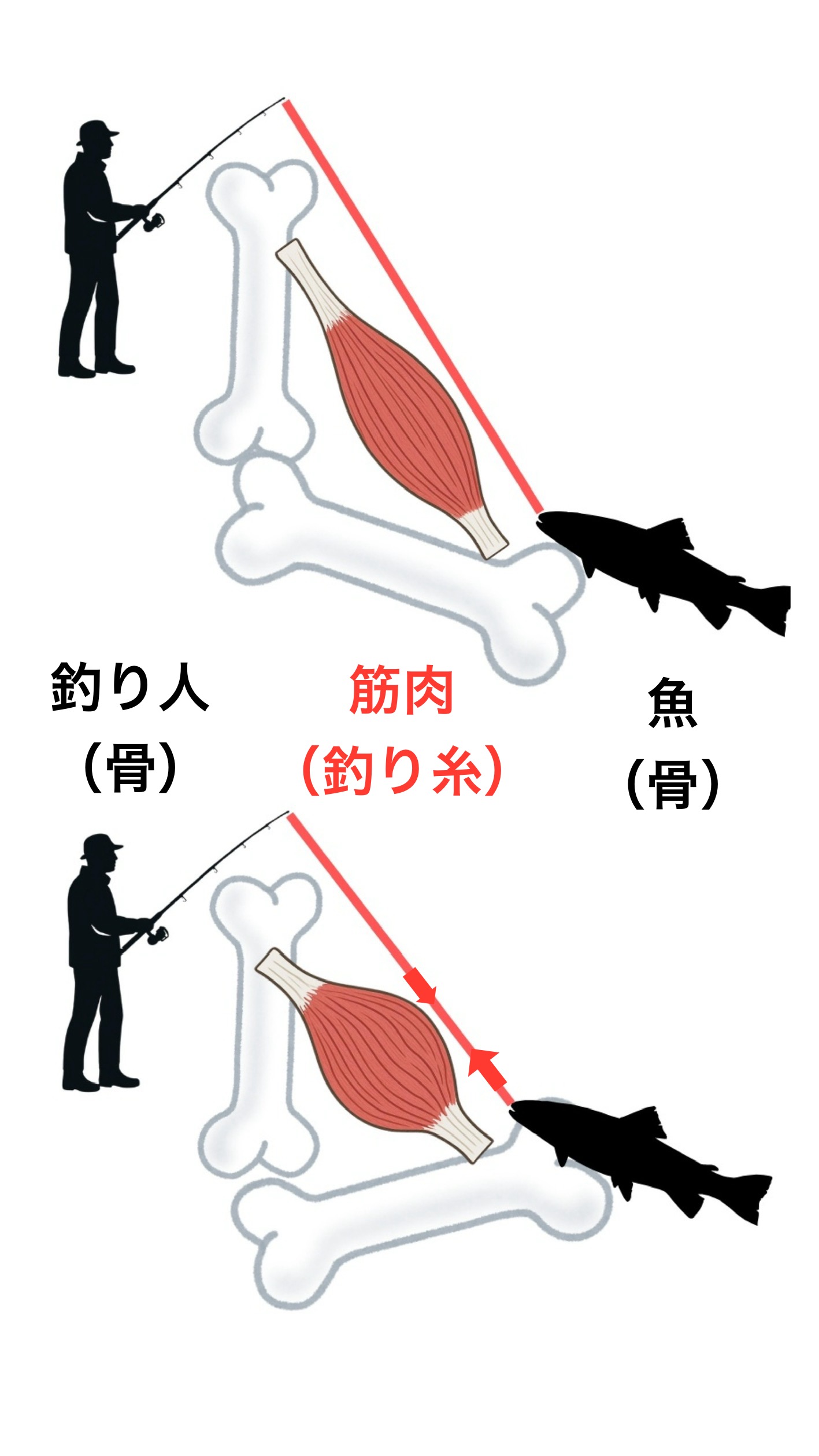 釣り人が釣り糸を引っ張ると(筋肉が収縮すると)、魚側が釣り人に近づいていきます(骨が近づいて関節が動きます)。