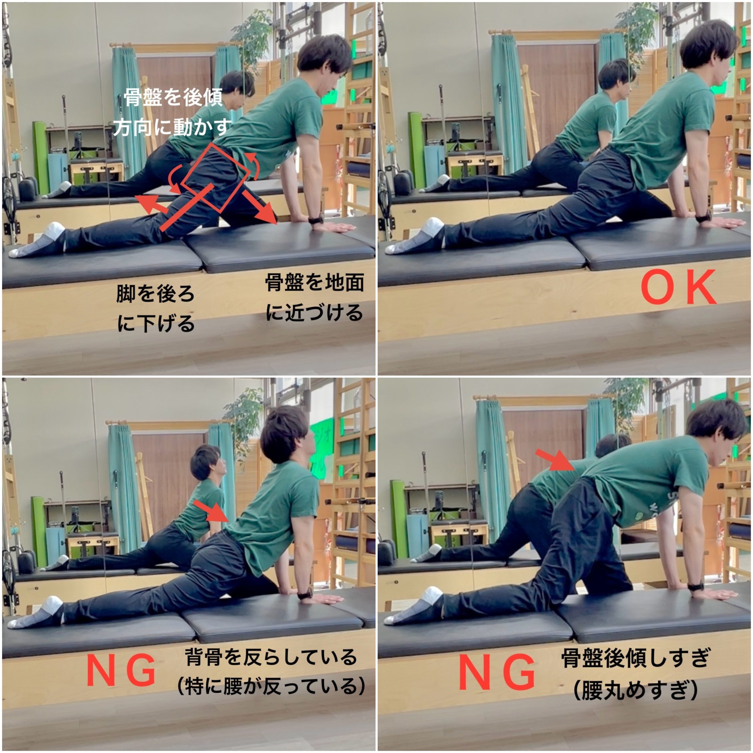 ❷骨盤を丸める(= 後傾)・腰を丸める方向に力を入れて、お腹とお尻に力を入れて、腰が反らないようにする。