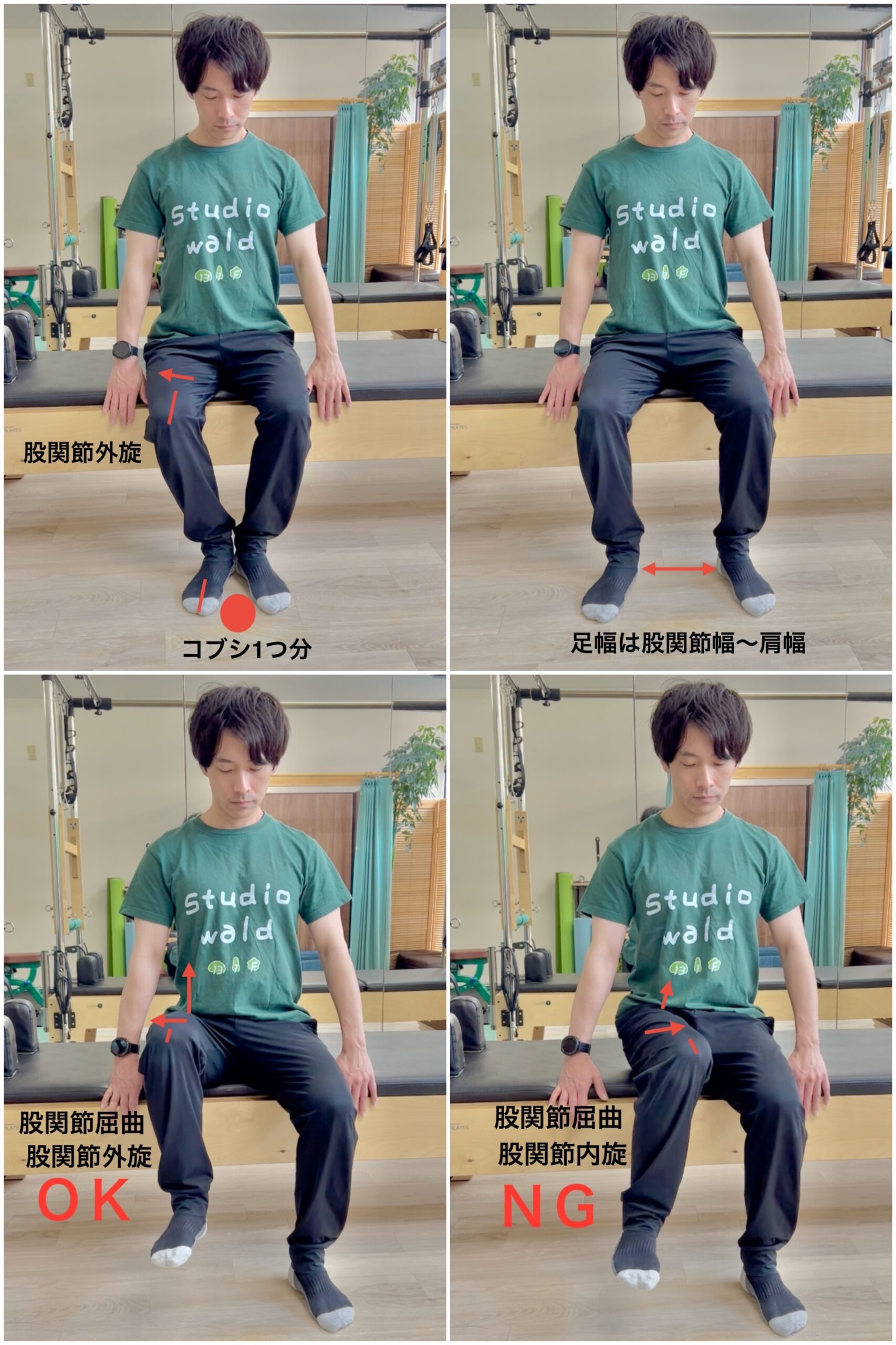 意識が向いた瞬間に、驚くほど頻繁に内股(膝が内側に向いている)姿勢をとっていることに気づく方は多いです。それくらい普段は気づきにくいクセでもあります。