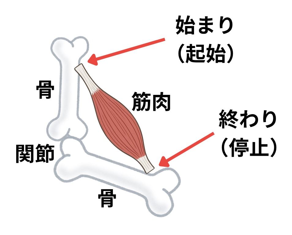 まずは筋肉について。 筋肉には始まり(起始)と終わり(停止)があり、それぞれ骨に付着しています。 筋肉が収縮すると、骨の一方が引きつけられる、もしくは、両方が引きつけられて、関節を動かそうとします。