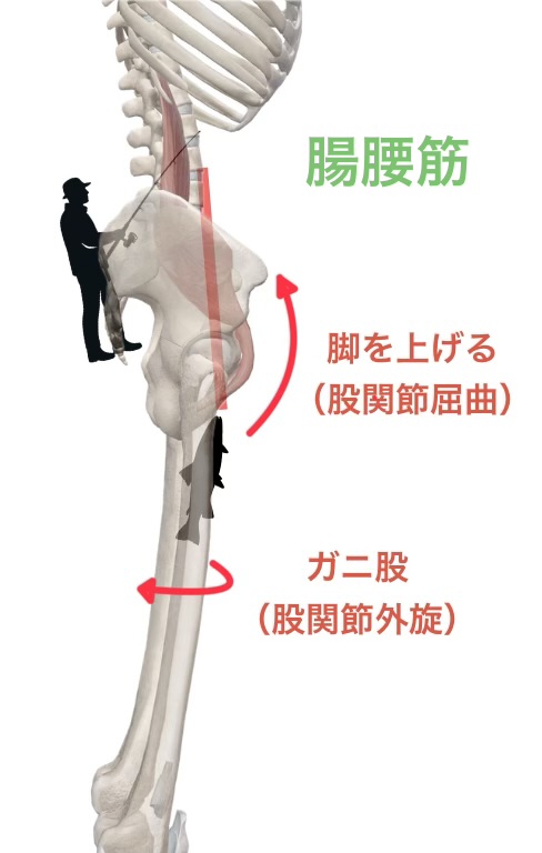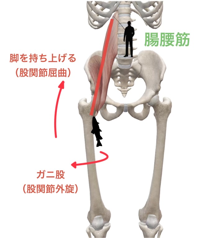 釣り人と魚の位置関係からして、腸腰筋の動きは、ももを上に持ち上げる動き(= 股関節屈曲)と、ももを外回りに回旋させる動き(ガニ股)(= 股関節外旋)が想像できると思います。