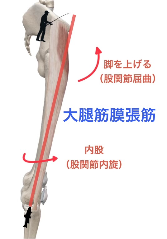 釣り人と魚の位置関係からして、大腿筋膜張筋の動きは、ももを上に持ち上げる動き(= 股関節屈曲)と、ももを内回りに回旋させる動き(内股)(= 股関節内旋)が想像できると思います。